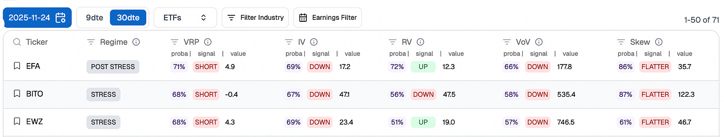 You get clean signals you can actually trade on: variance-premium harvesting, long/short and cross-ticker relative value, forward vol and term structure, skew swaps. In other words, the full daily read of the vol surface.