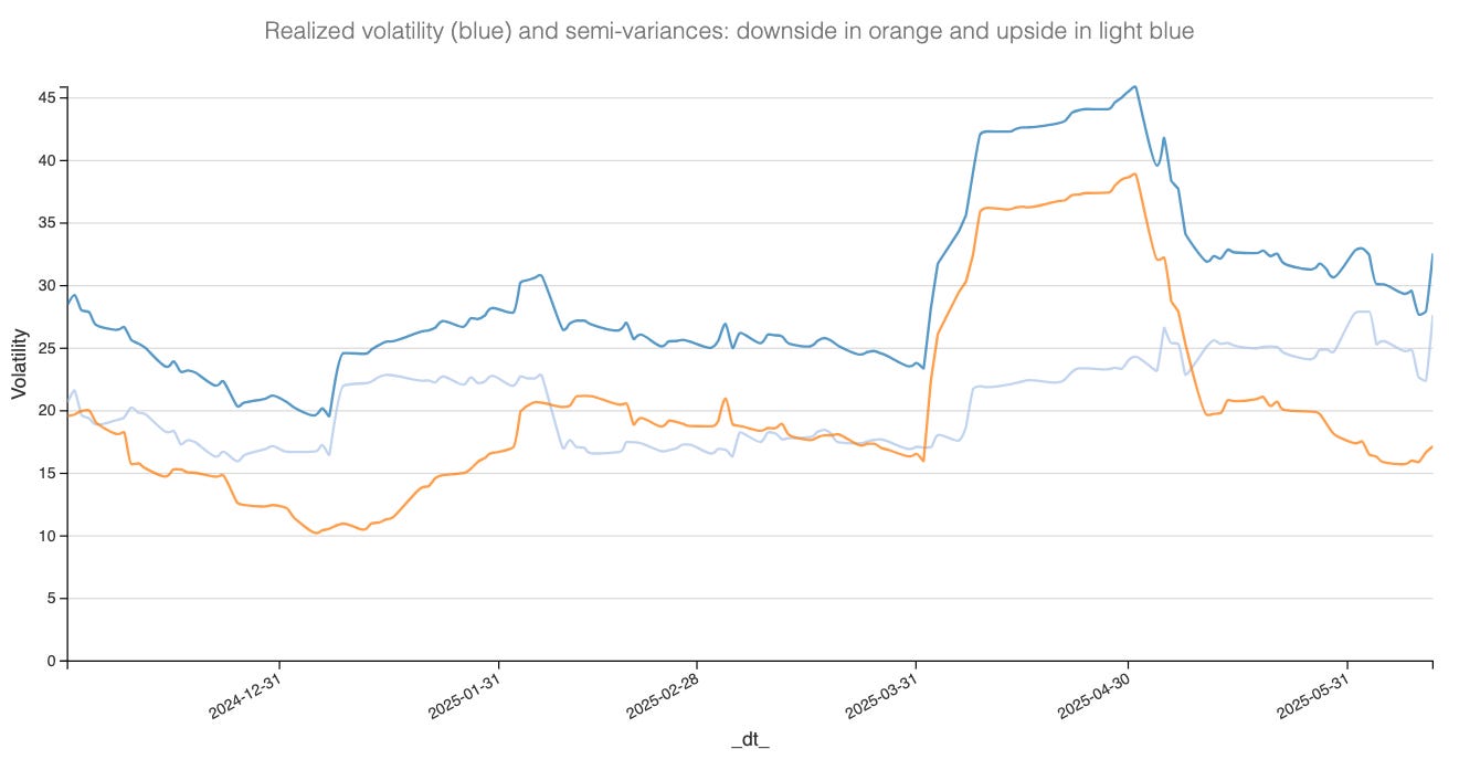 And remember last week’s note on volatility clustering? It is plausible we remain elevated for a while before short-term realized vol begins to cool off. Another signal worth tracking: realized skew, and the divergence between upside and downside semivariance.