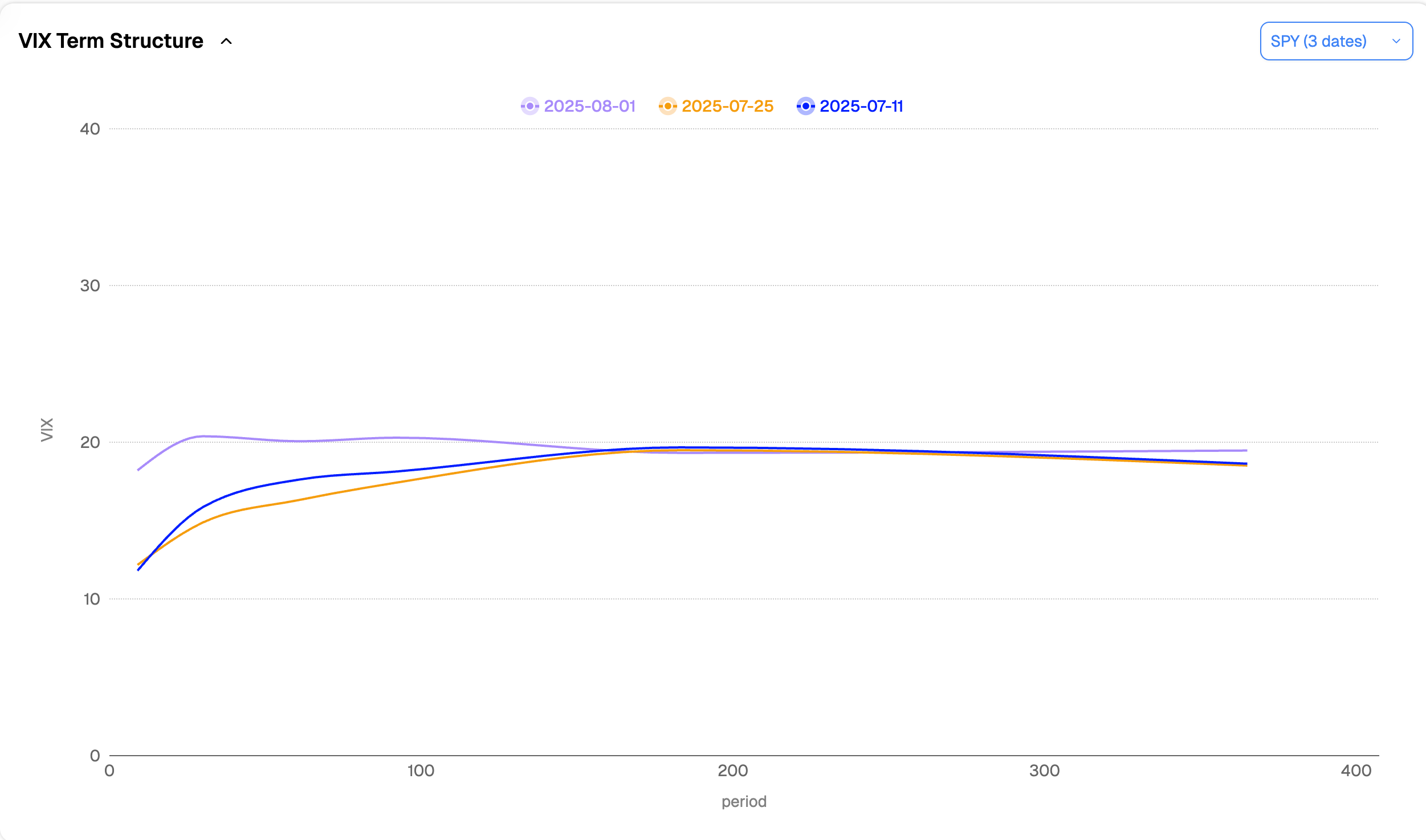The term structure in SPX has noticeably flattened—markets want answers from the Fed, and they want them now. A 3M/6M calendar makes sense here. We like the Sep 30 / Dec 30 structure. It is clean. It is patient. And it benefits from time.
