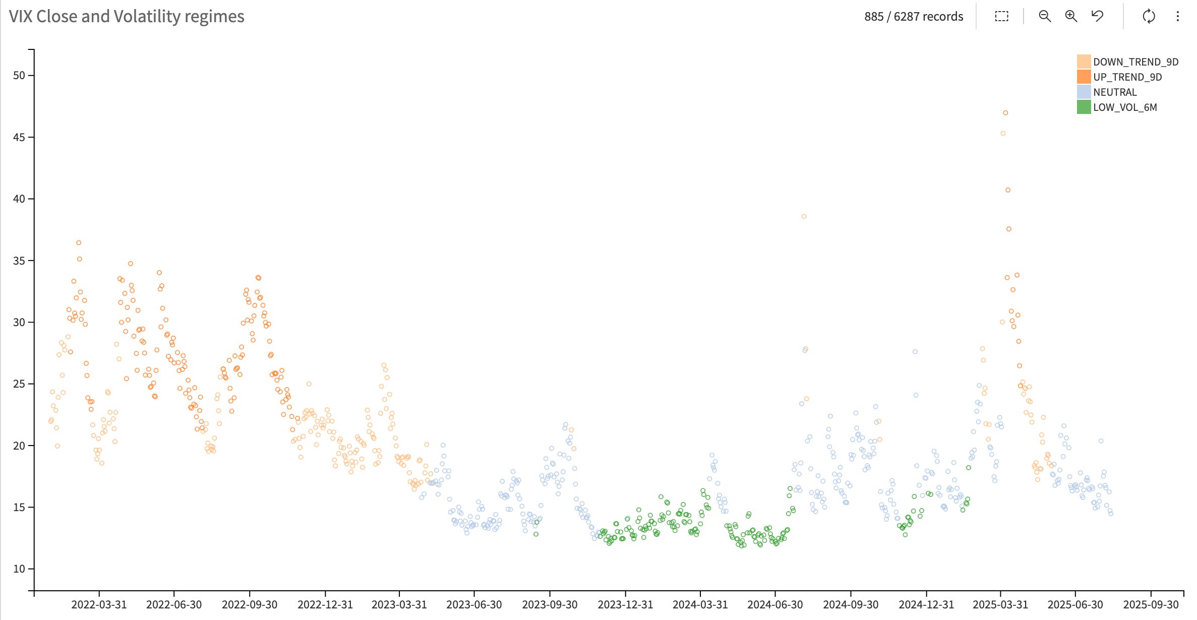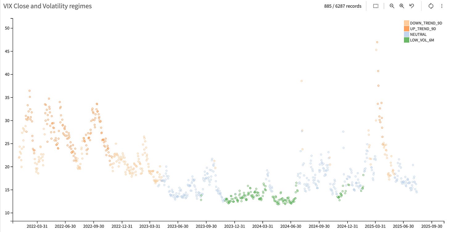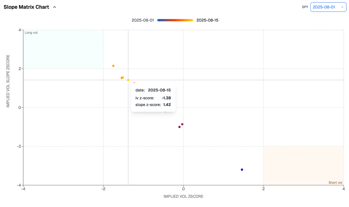 That question is difficult to answer. But if we place today’s implied volatility against the backdrop of how steep the contango currently is, we are edging into a quadrant where, historically, implied volatility has been prone to mean reversion. Nuance matters here: mean reversion does not necessarily imply a return to 20 and staying there. It looks more like what we saw a few weeks ago—a broad market pullback of 1–2%, maybe 3% if fortunate—before dip buyers and vol sellers inevitably re-emerge.