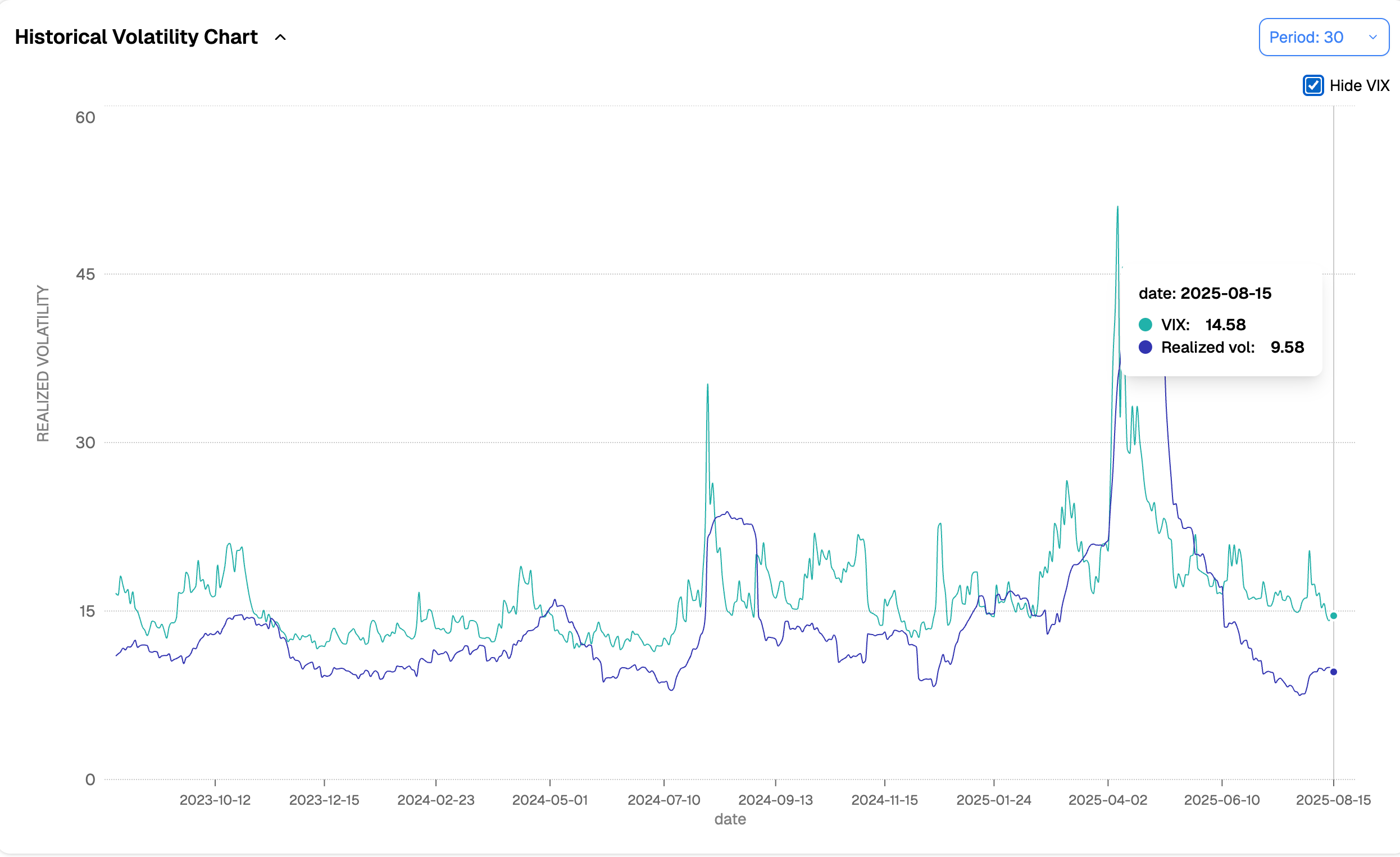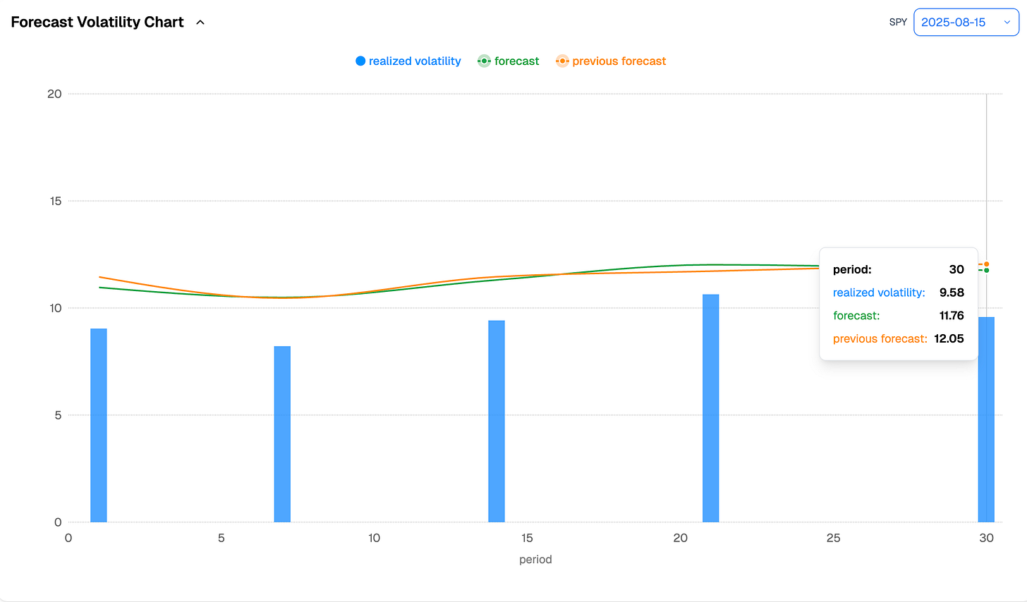 Another angle here is the semi-variance. Break realized volatility into its components—upside versus downside returns over a 9-day window—and it becomes clear: the early August blip has faded, and the bulk of realized volatility in the past 10 days has come from the upside.