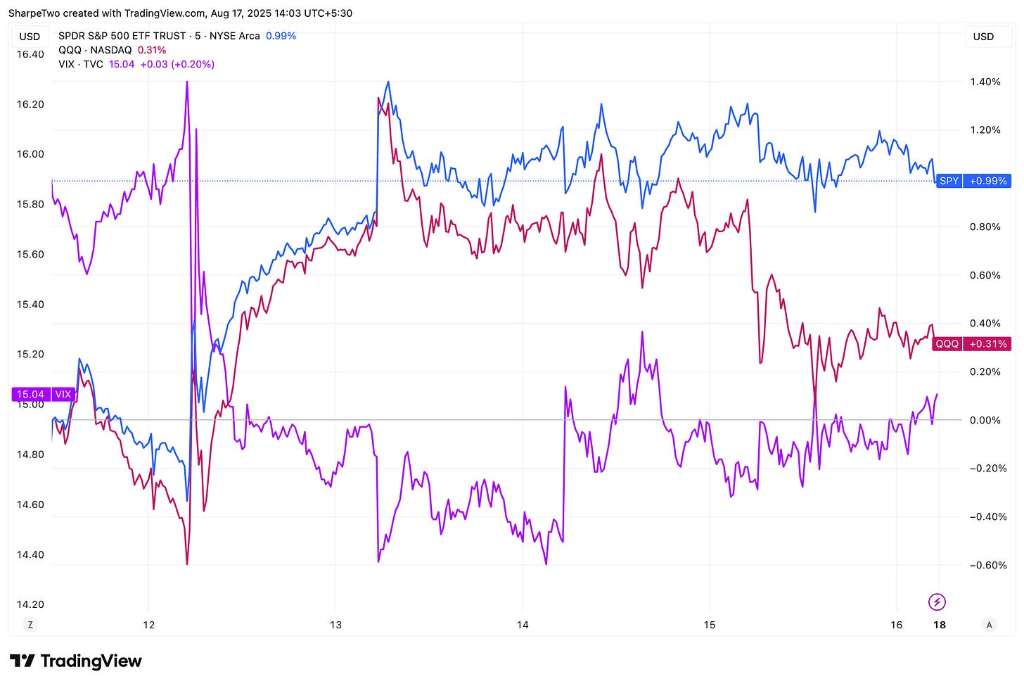 But on Thursday, PPI disrupted the mood: a much stronger-than-expected 0.9% versus the 0.2% forecast. A reminder that tariffs may slowly be filtering into the economy. Was it enough to derail everything? Not really. Volatility ticked higher that day, but the week as a whole remained contained. The grind higher continues, though with cracks worth watching.