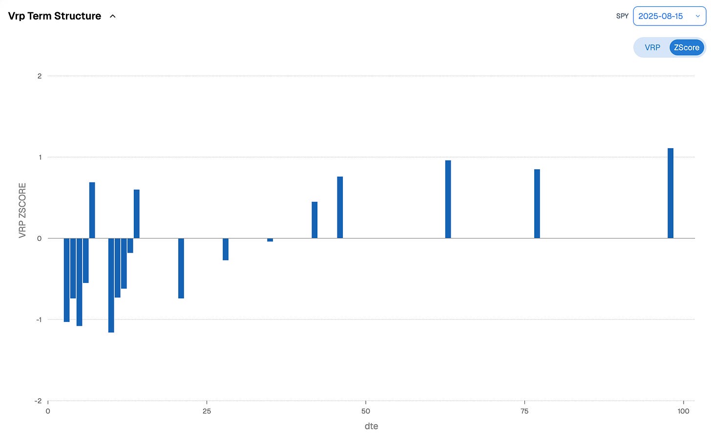 Viewed through a z-score, the picture is even clearer: the front weeks should be avoided, but the one-month VRP is not as stretched as it was earlier this summer. Of course, it is unlikely we will see realized collapse back to 7 with such a heavy economic and geopolitical agenda ahead. But are we headed for 15 either? Nothing is impossible—but recall our forecast for realized volatility.