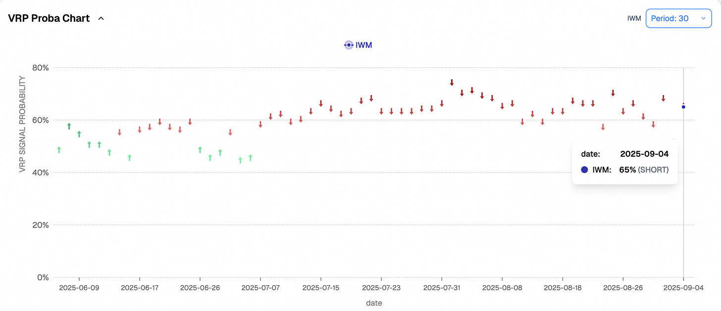 A few weeks back we talked about selling vol in IWM, and it worked out nicely. The fundamentals have not changed: with a few rate cuts expected between now and year-end, as long as the US avoids recession, the index should be fine. In fact, our models currently predict a 65% chance that realized volatility over the next 30 days will not exceed what the market priced at Friday’s close. Good enough reason to rinse and repeat the trade from two weeks ago? Absolutely. You can try to time it, or put it on now — and if the market later hands you better prices, just add more.