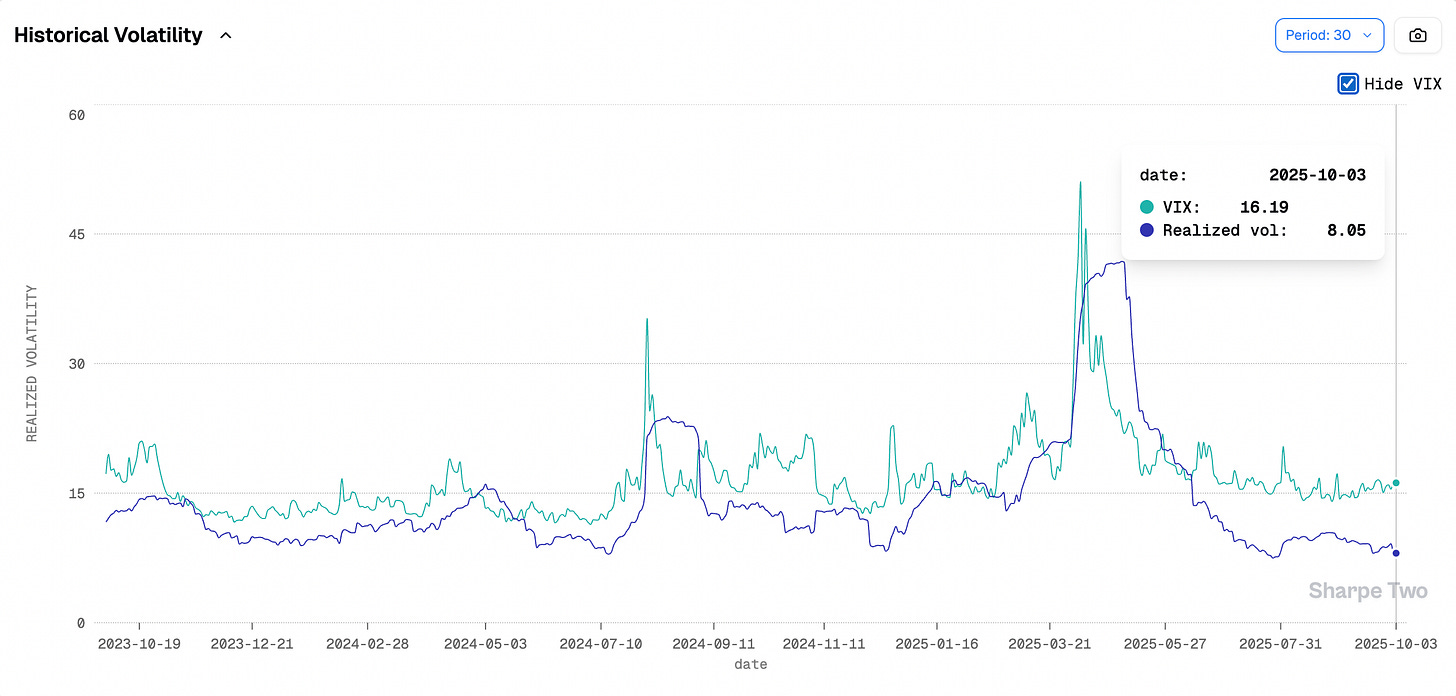 And right now, the message from the data is simple: reset, refocus, and look at what is actually in front of us. Since June, realized volatility has been glued to the floor, the VIX has stopped venturing above 20, equities are up 20%, and rates are trending lower.