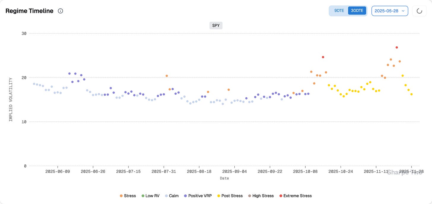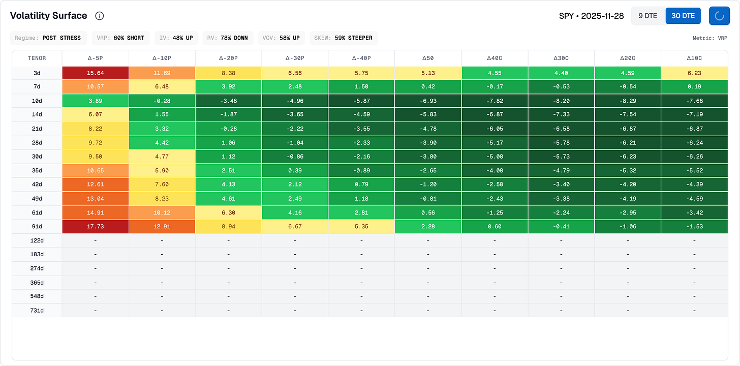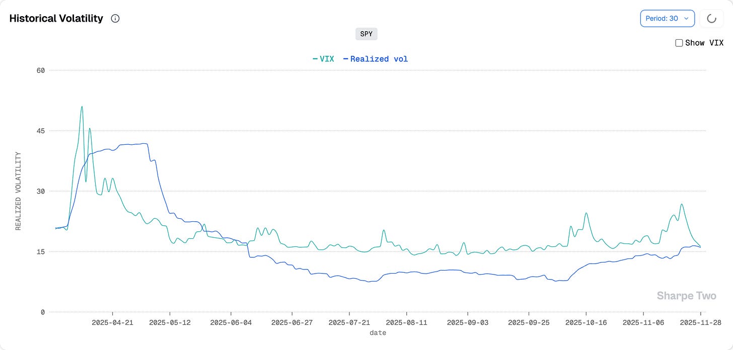 We did things in reverse today, mostly because it was a short week with little to talk about. So for once, we will use this section to focus on what the data are telling us. As it stands, the VRP is the most compressed it has been in months. With realized volatility at 16 and the VIX at 16, you do not want to be selling vol right now. We insist on this. It was a great trade all summer when realized volatility sat at 8, but at this stage, selling premium and hoping to collect theta is the surest way to get steamrolled.