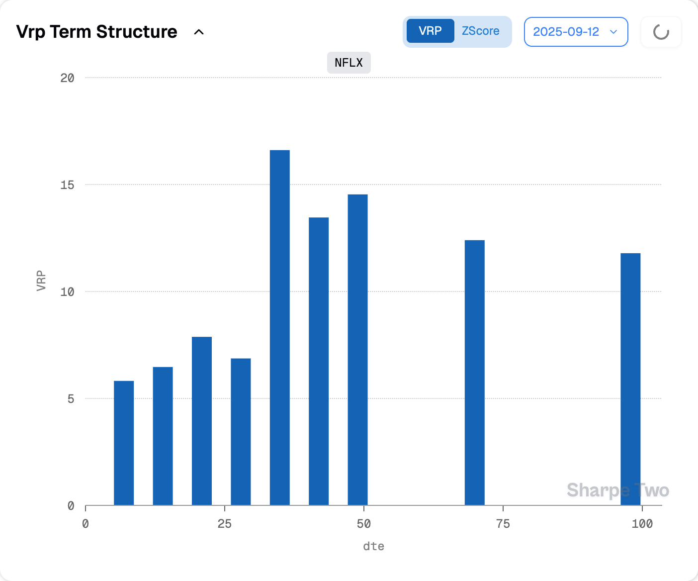 At first glance, the front part of the VRP term structure on NFLX screams “short me.” Variance risk premium is positive at +5 points, implied is holding near 30 while realized drifts around 25, and skew is hardly pressing higher.