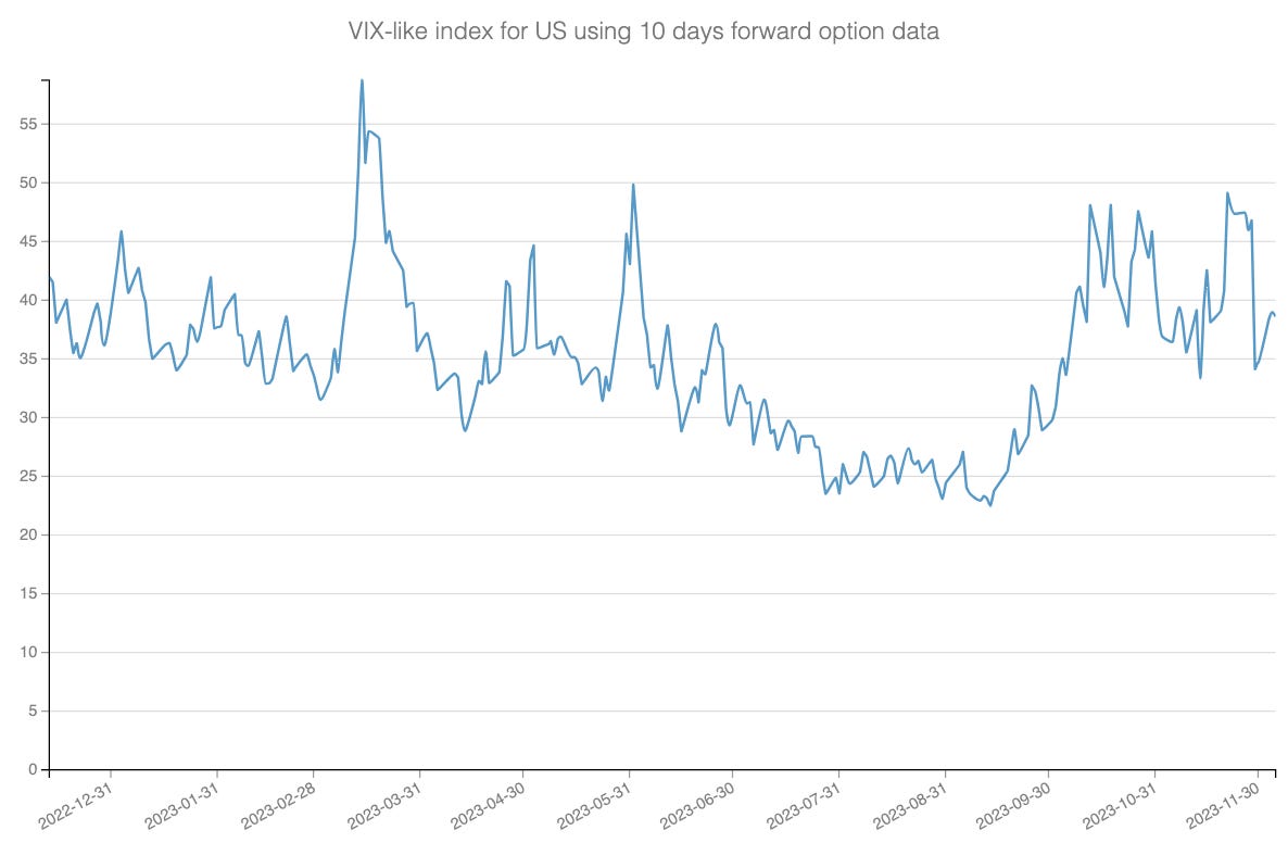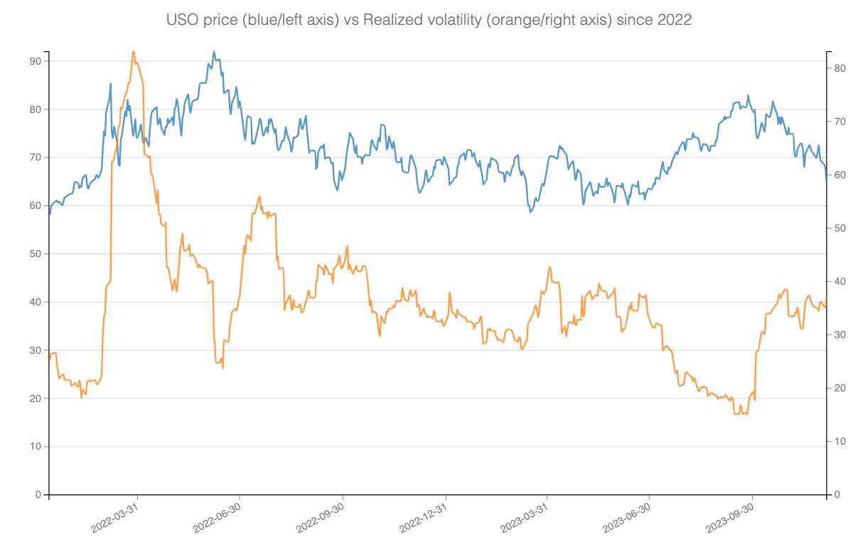 This chart reconstructs the VIX index for USO using only short-dated options. We're still observing elevated levels compared to this year's low.