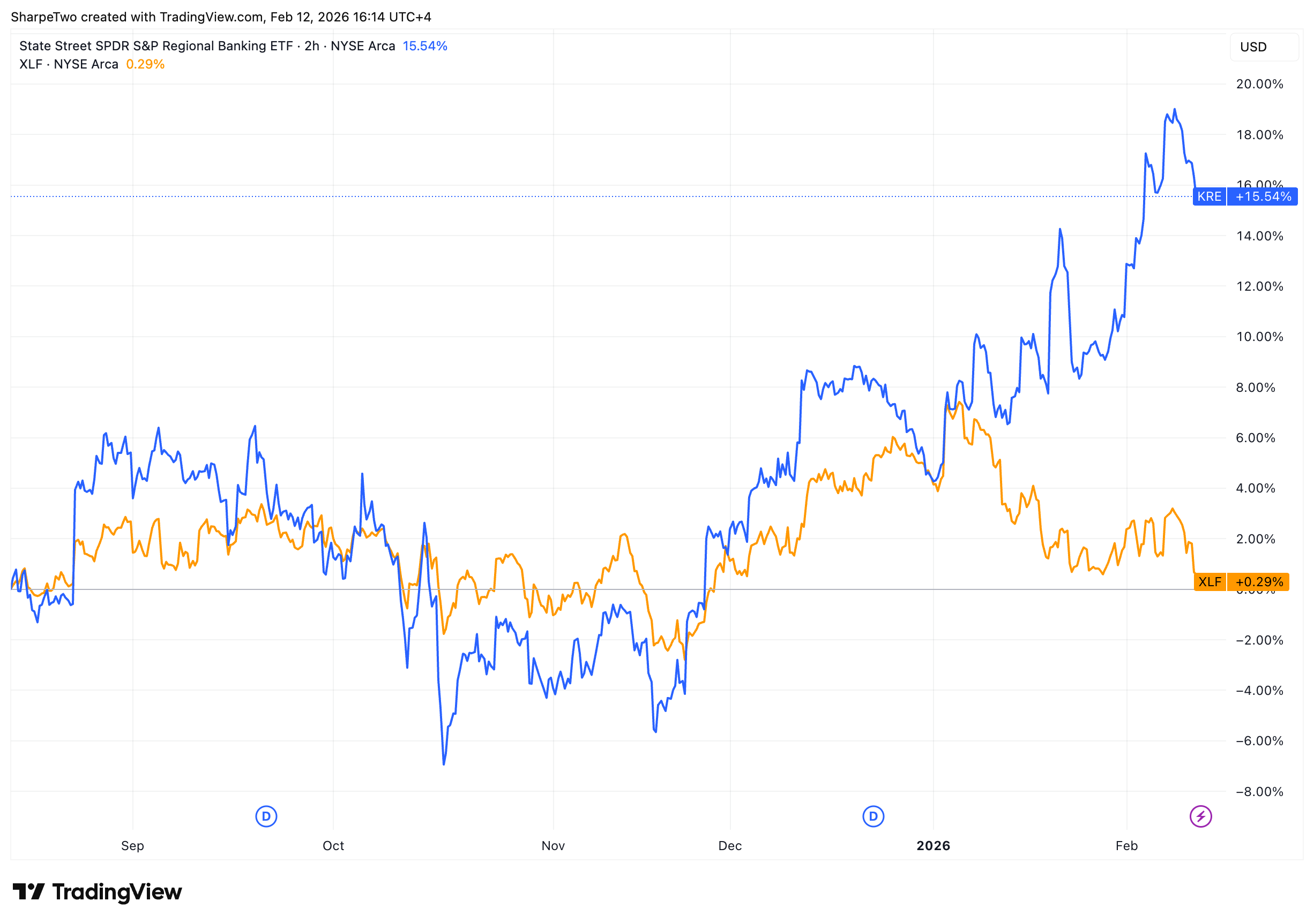 Regional banks have had a great time since the end of 2025, adding almost 20% in a little less than 3 months. Long gone are the peregrinations around Thanksgiving. The combination of deregulation hopes, a steeper yield curve, and the prospect of a more accommodative Fed Chair has lifted the sector.