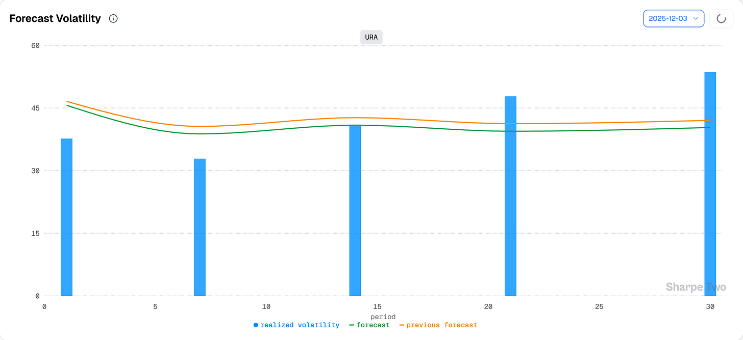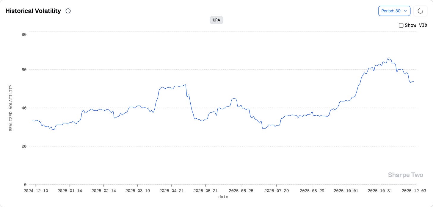One can easily eyeball that realized volatility for URA went through the roof over the last few weeks: from below 40% as we wrapped up the lazy summer to above 65% at the peak in November. A move not for the faint of heart, and a reminder that things can change just as quickly in the volatility world as they do in the directional one.
