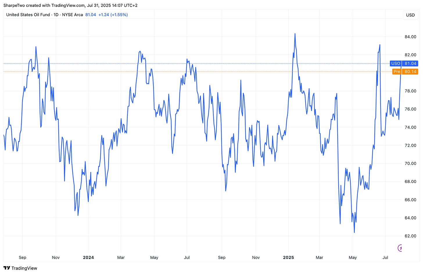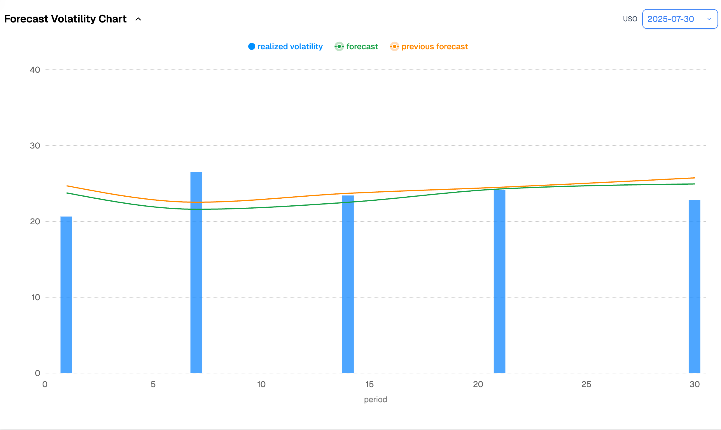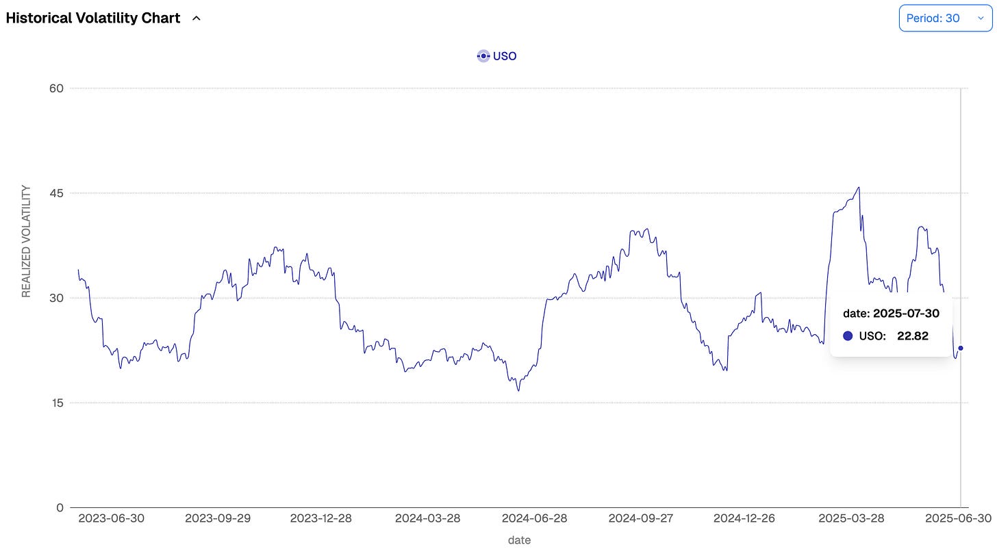 We do not currently expect USO to trade much differently from how it has behaved recently. Barring surprises, 30-day realized volatility should remain anchored in the mid-20s. You would need a serious geopolitical escalation for USO to truly wake up and break meaningfully above 30%.