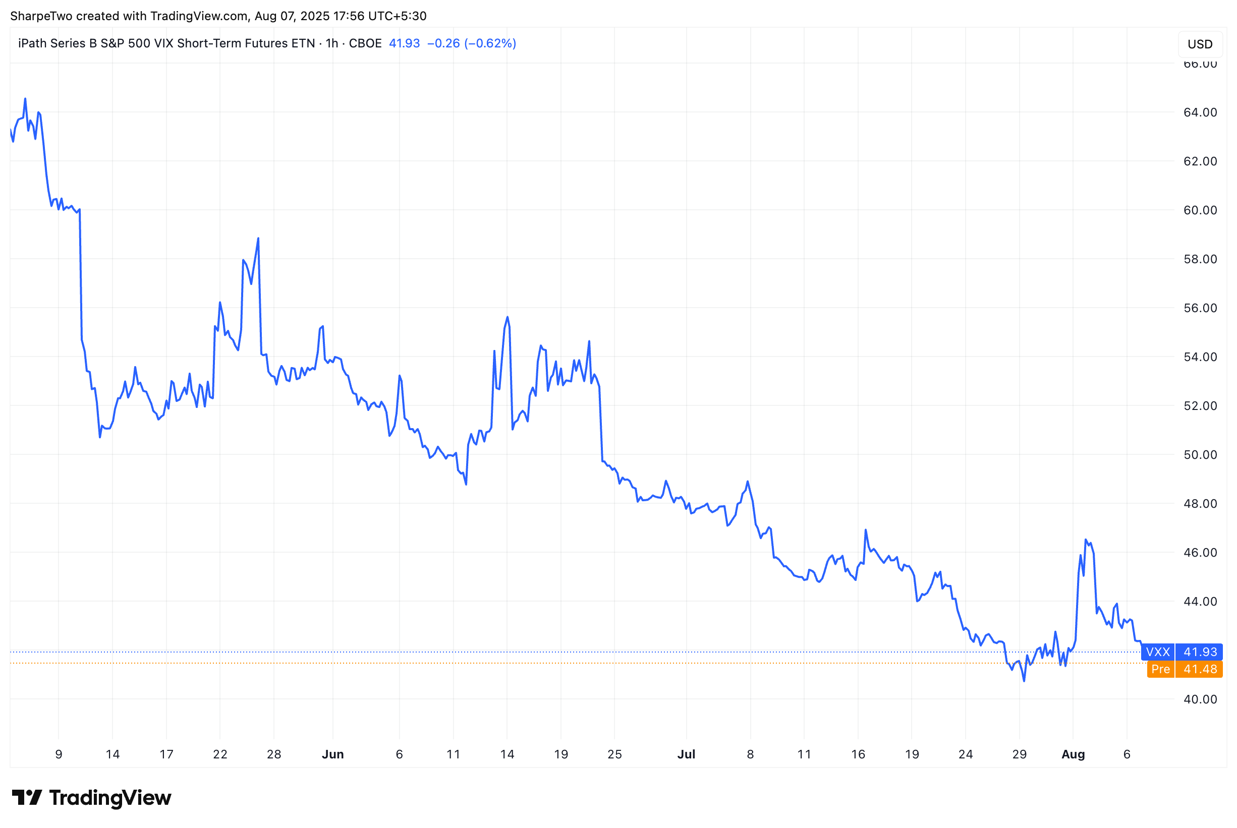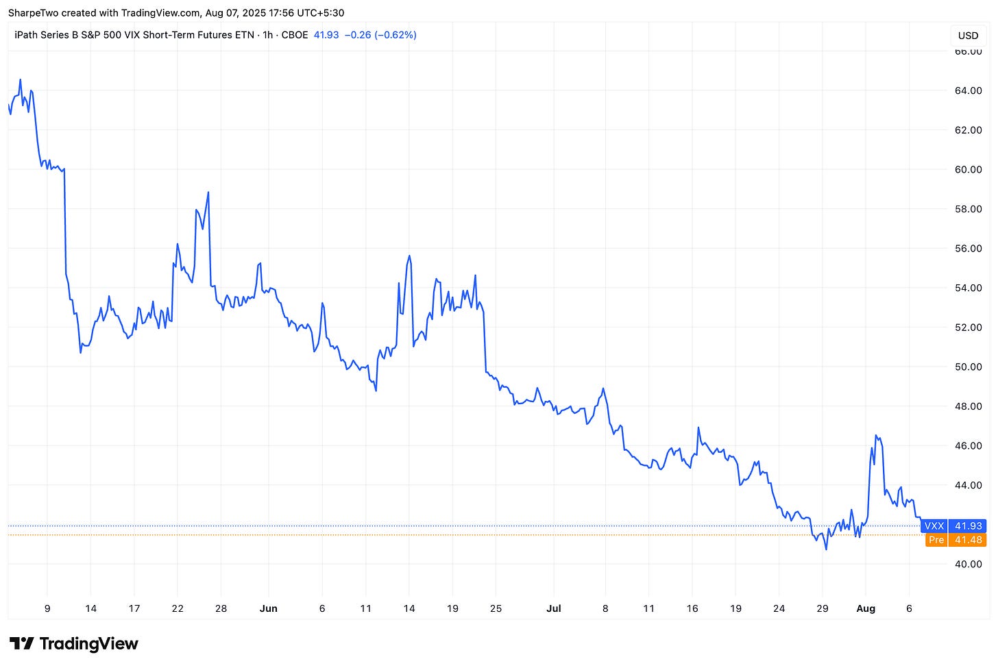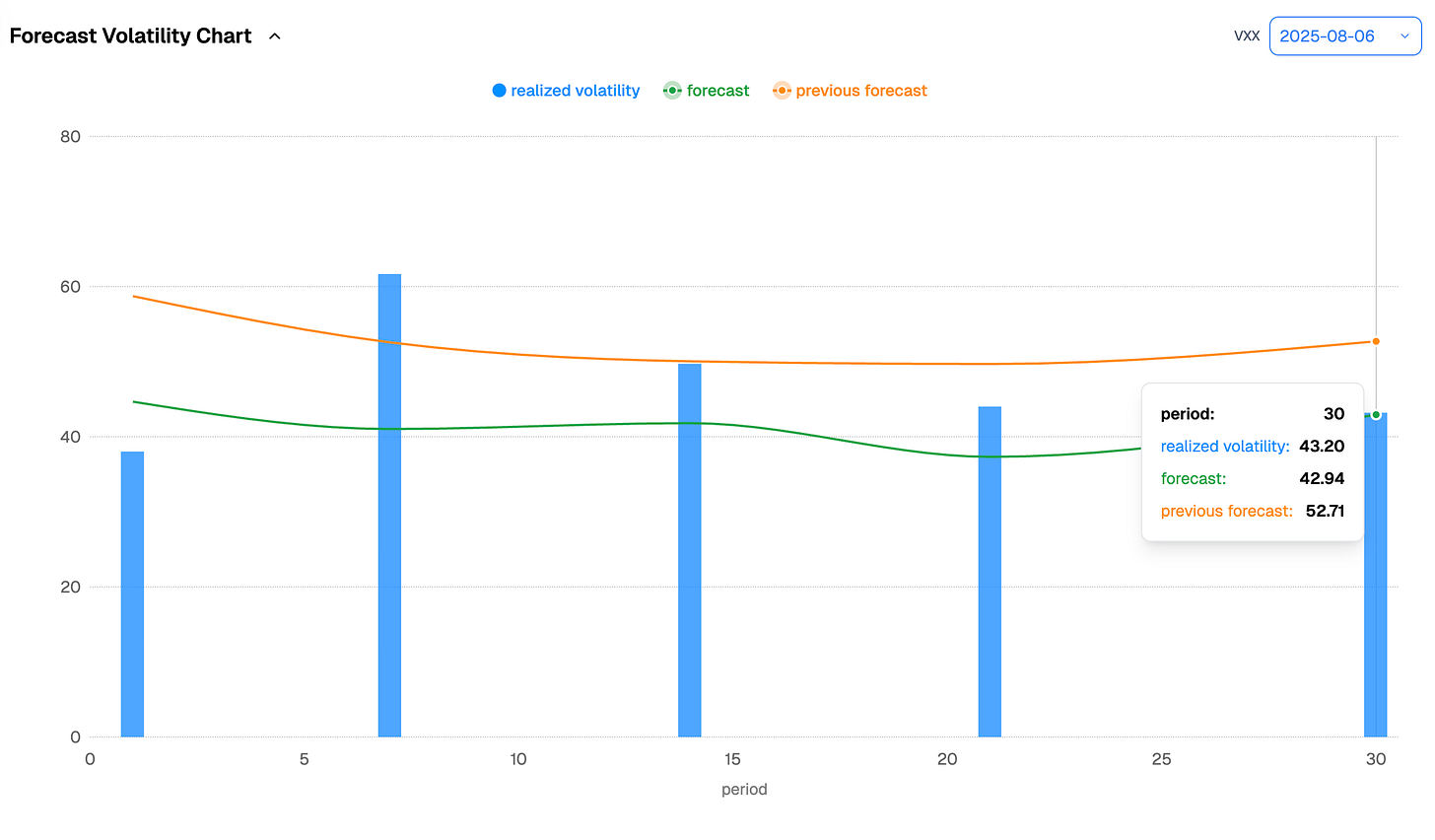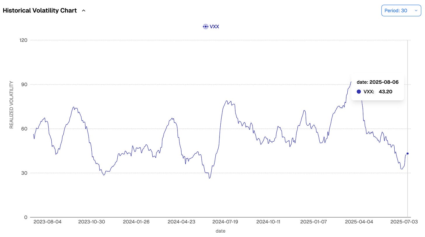 From an eye-watering 90 at the height of the tariff crisis to the low 30s last week as the lazy summer dragged on—it’s been quite the ride. With the calendar filling up again over the next few weeks as we head into September, it’s unlikely we revisit the 30s any time soon. That said, VIX 16 still tells you a lot about market expectations, and our realized volatility forecast for VXX is very much in line.