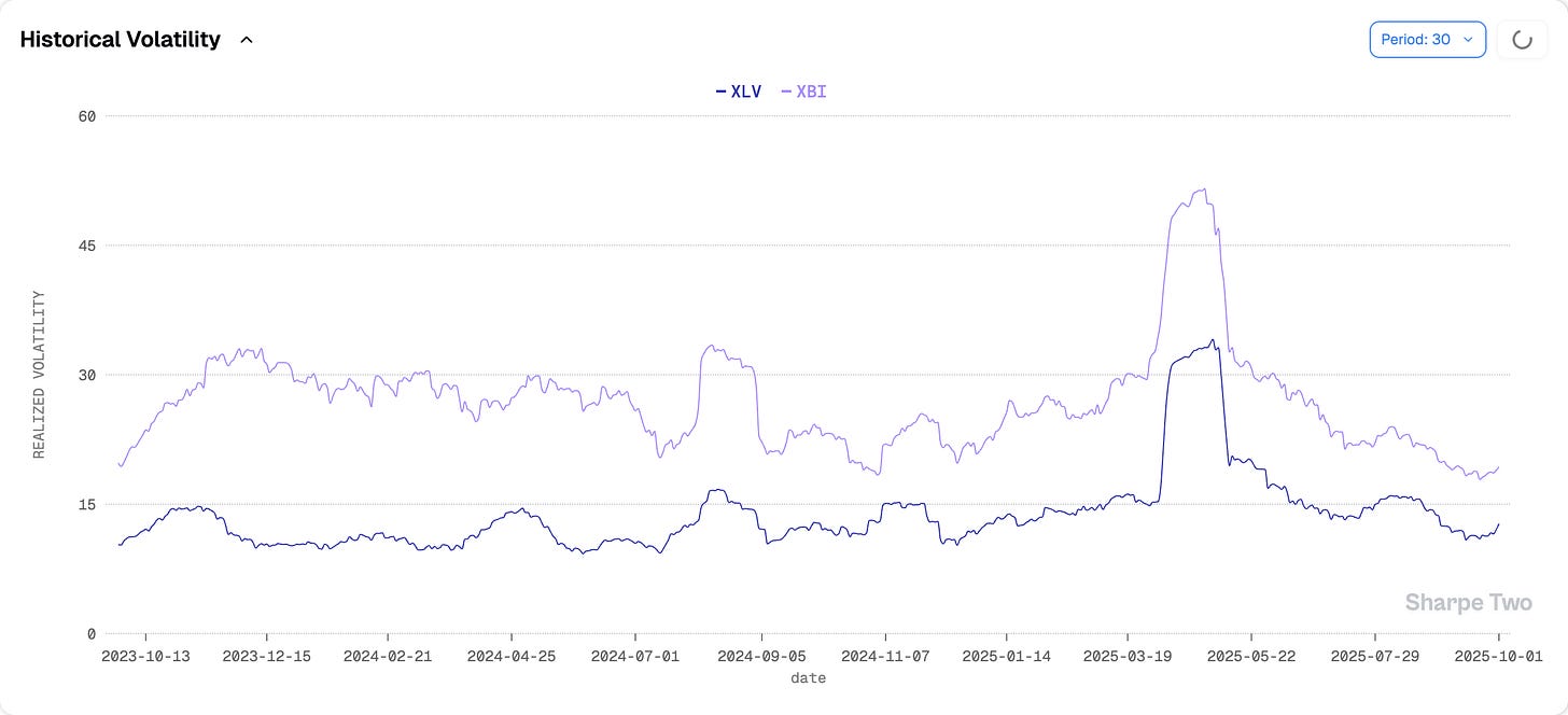 Compare that with 2023, when XBI traded around 30 annualized realized volatility while XLV sat at half that. Today XLV is at 12, XBI at 18. If you were playing the long–short volatility spread, that divergence might spark some ideas — though of course you would need to weigh their implied volatilities before making any move.