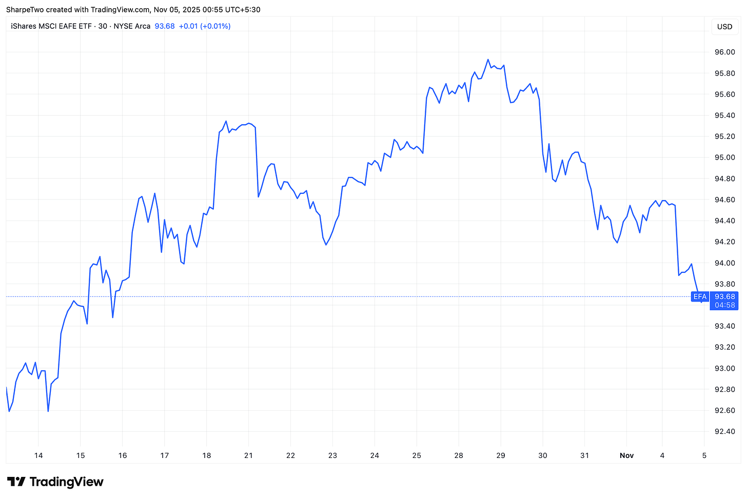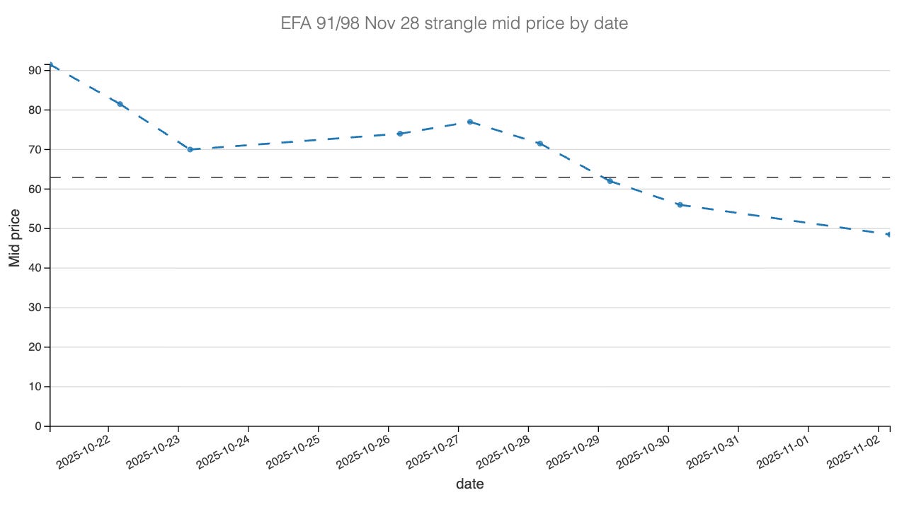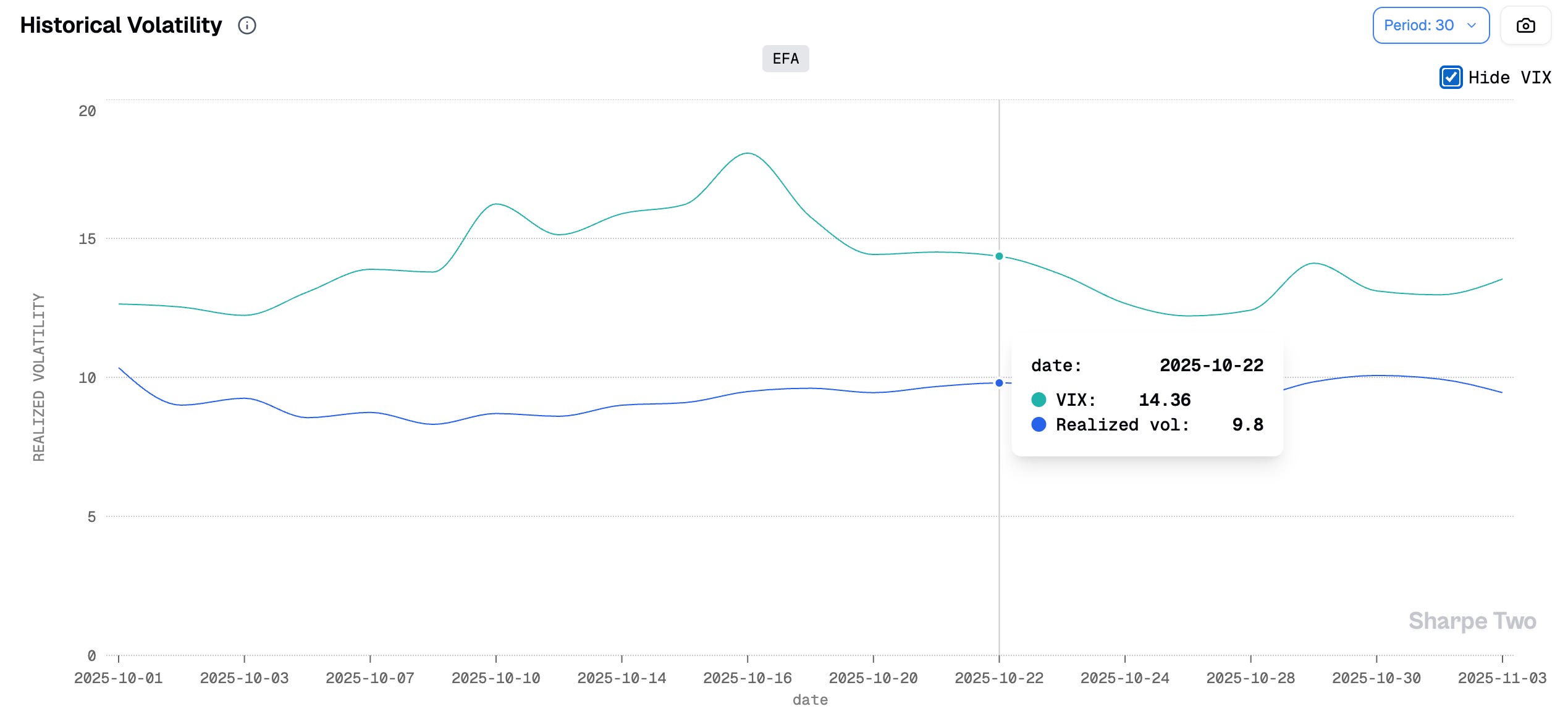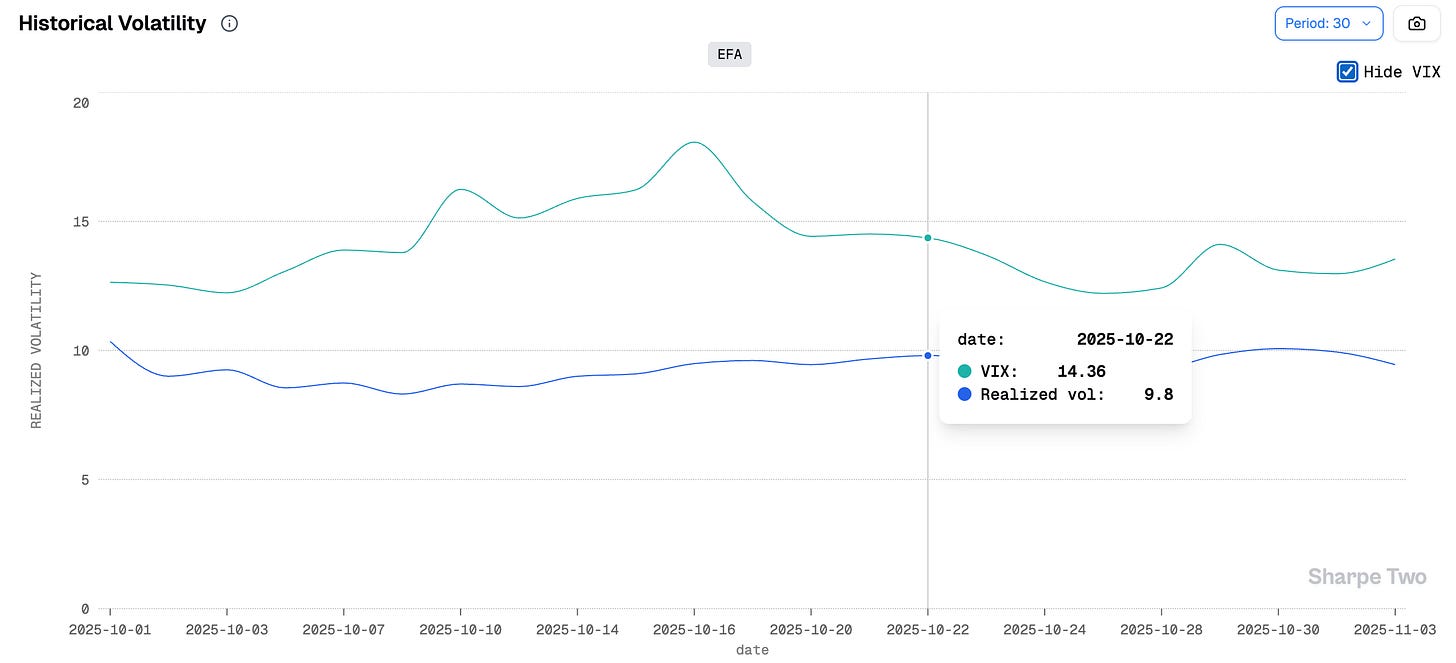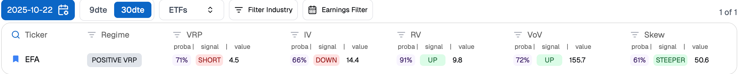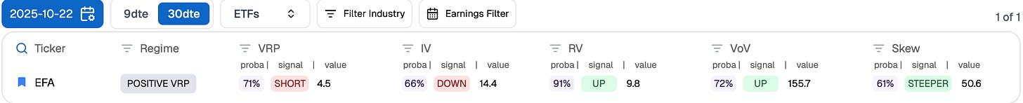 In our Signal du Jour from two weeks ago, we highlighted an opportunity to short implied volatility in EFA. At the time, volatility from U.S. equities had spilled over into international markets, and investors were staying cautious ahead of the critical Xi–Trump meeting and the upcoming FOMC. Data-wise, our system was pointing to the following: