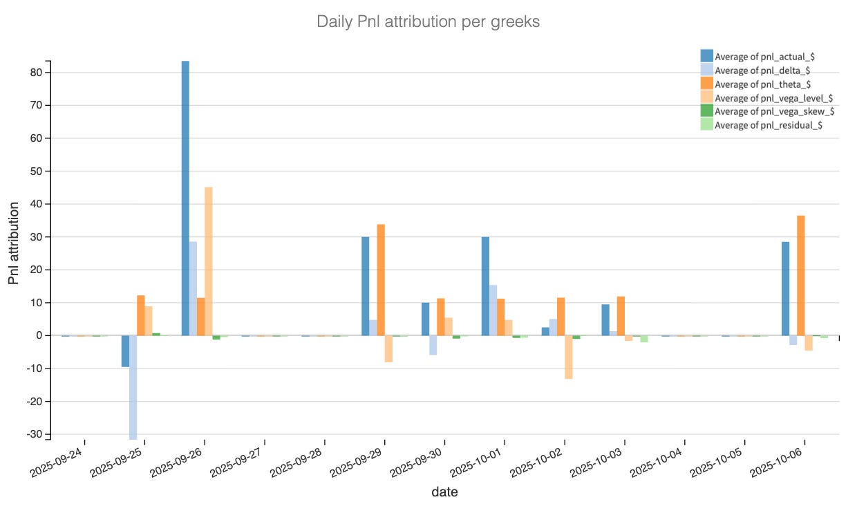 The attribution chart tells a clear story: the profit came almost entirely from carry and volatility compression, exactly in line with the initial thesis. Theta and vega-level effects were the consistent drivers from day one. The early mark-to-market bump visible around September 26 was a perfect reflection of the implied volatility drop from 23.5 to 21 — the strangle gained nearly its full two-week target within four sessions.