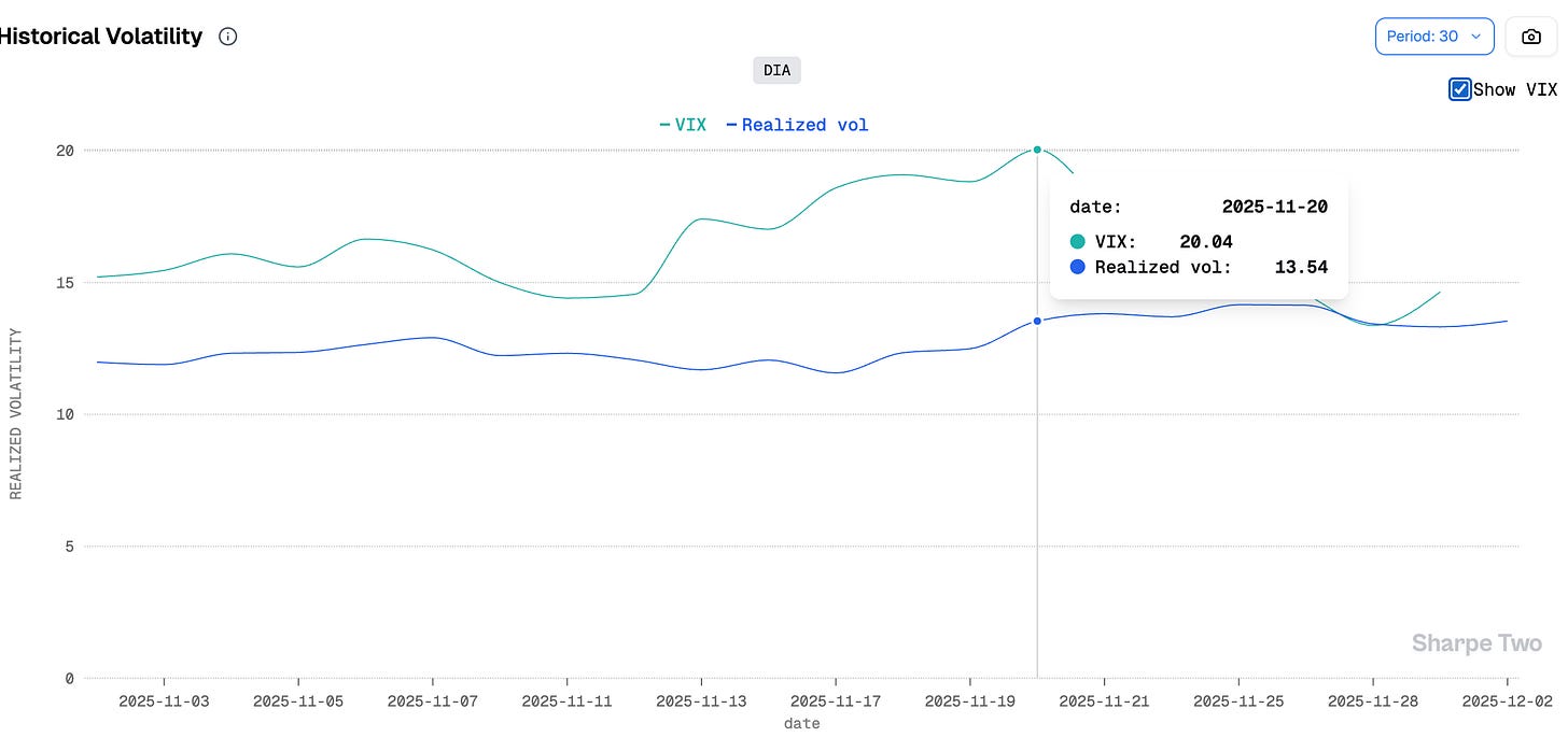 To this day, we do not have a good one: why was the market rocky that specific week, then stopped for Thanksgiving and after? It is hard to tell, and to be honest we do not always need one. We know that volatility spikes and eventually it comes down. The hard part is, as always, the spike: had you entered on Thursday morning, post NFP and NVDA results, when a breath of optimism was blowing over the marketplace, you would have had a few uncomfortable hours as vol of vol was doing its thing and brought the VIX much higher in session.