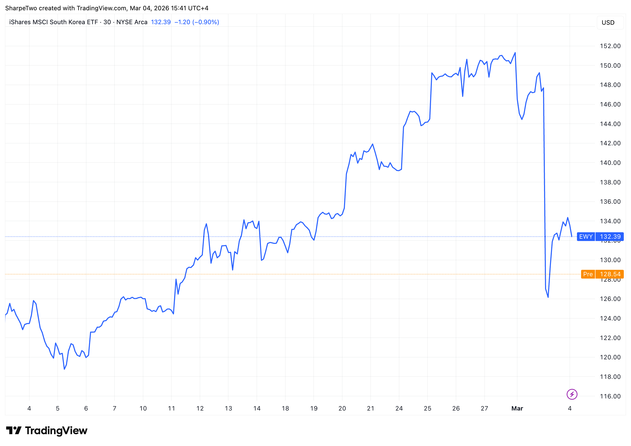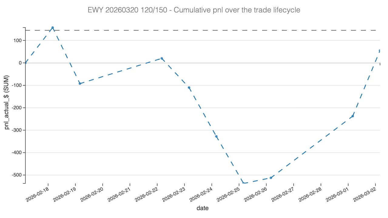 In our Signal du Jour two weeks ago, we highlighted a short volatility opportunity in EWY, specifically the 120/150 strangle for the March 20th expiry.
