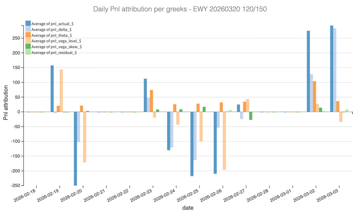 Delta was the dominant source of PnL volatility. The cumulative delta contribution swung from a brief positive of +$140 on the first day to −$530 at the worst point, before recovering entirely to near zero. The daily attribution chart isolates the critical sessions: February 25th and 26th saw massive negative delta bars as the underlying rallied through our 150 strike, while March 2nd and 3rd saw equally large positive bars as the underlying collapsed back to entry level.