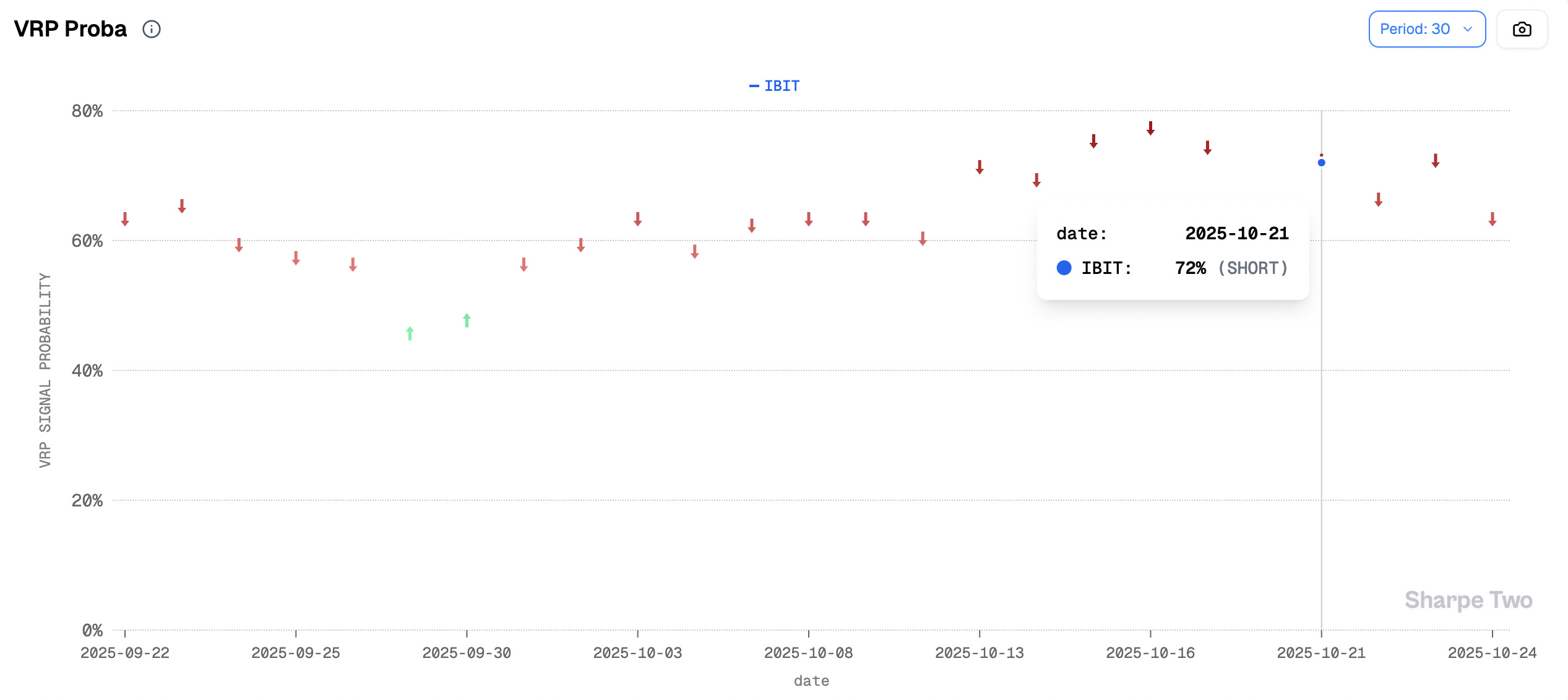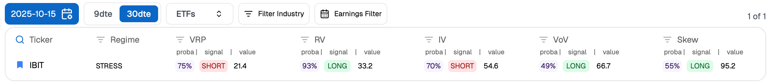 In our Signal du Jour from two weeks ago, we highlighted an opportunity to short overpriced implied volatility in the IBIT ETF, which provides exposure to spot BTC. At the time, bitcoin had just gone through one of its sharpest volatility bursts since April, and the market was growing anxious about a potential shift heading into year-end. Our systems showed the following: