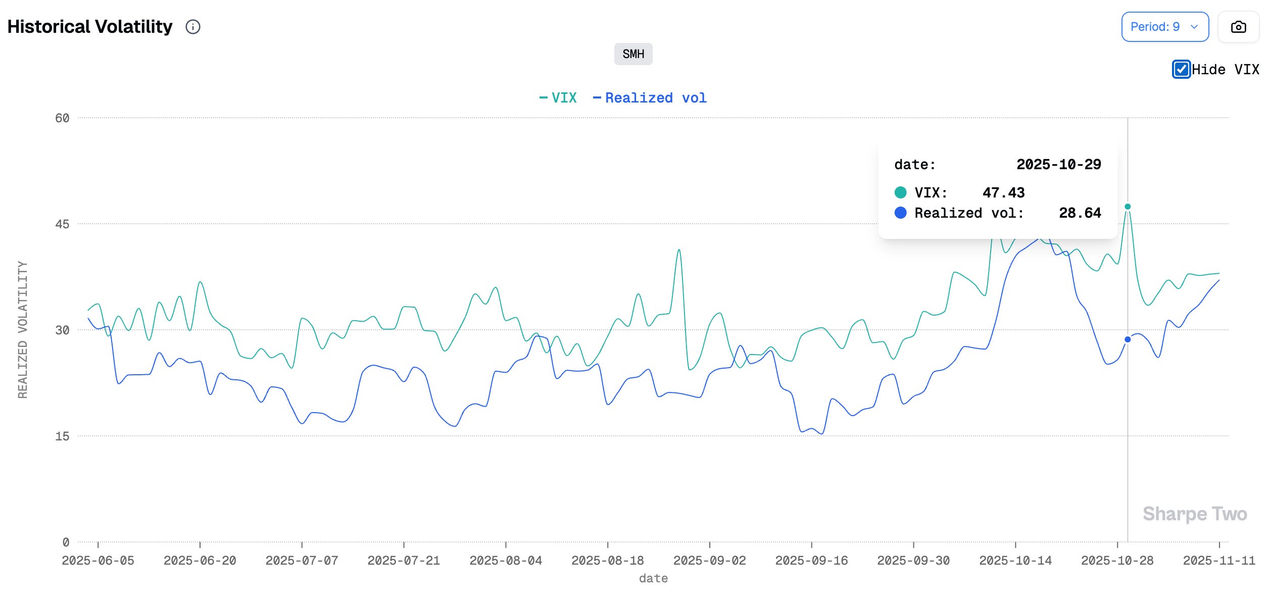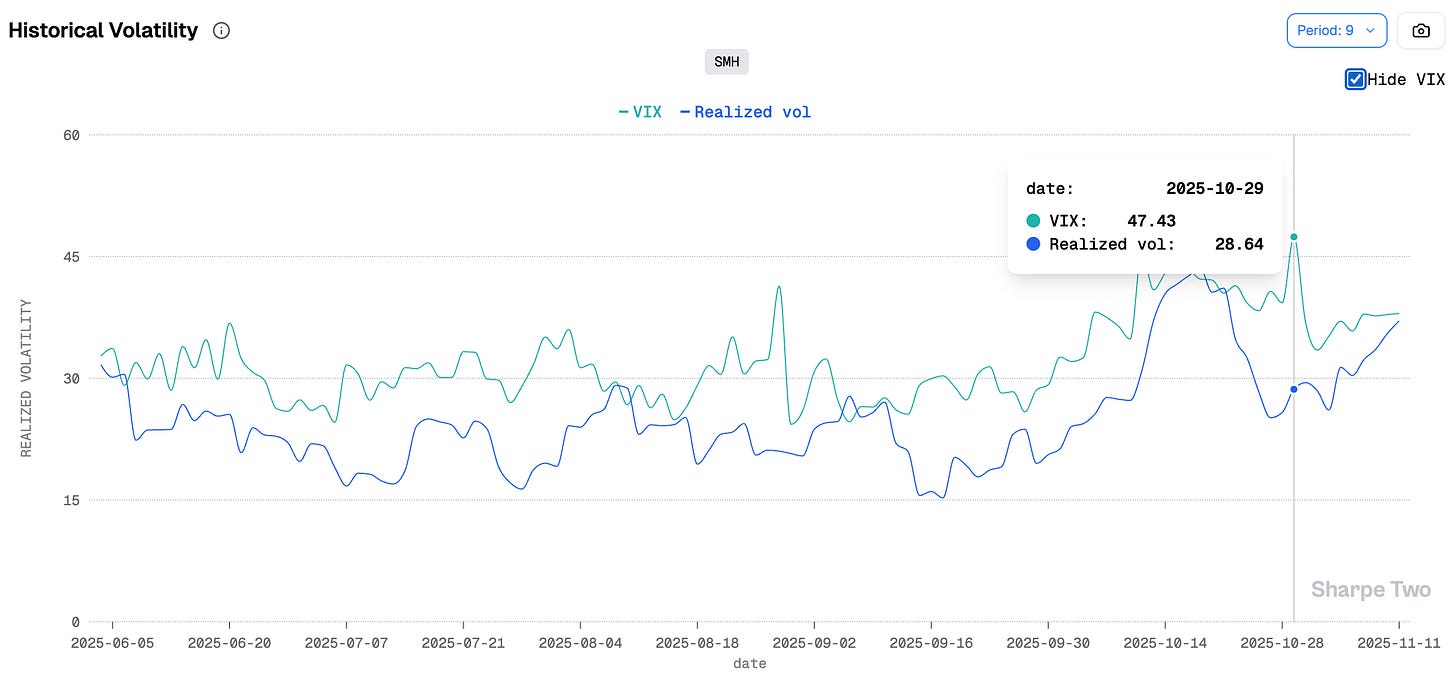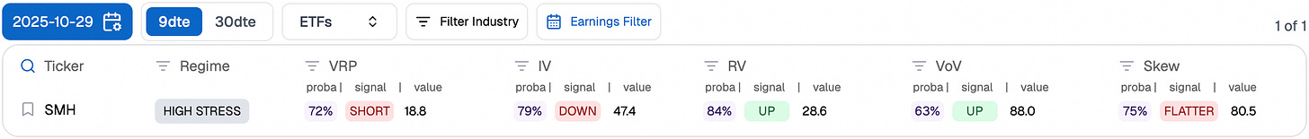 In our Signal du Jour from two weeks ago, we reported an opportunity to short volatility in SMH. This came right before the tech giants were set to report earnings and offer their latest take on the AI narrative. While, as usual, we will refrain from commenting on the earnings themselves or the bubble thesis, one thing was clear: SMH implied volatility was visibly inflated at the close on Wednesday, and our models were pointing to the following.