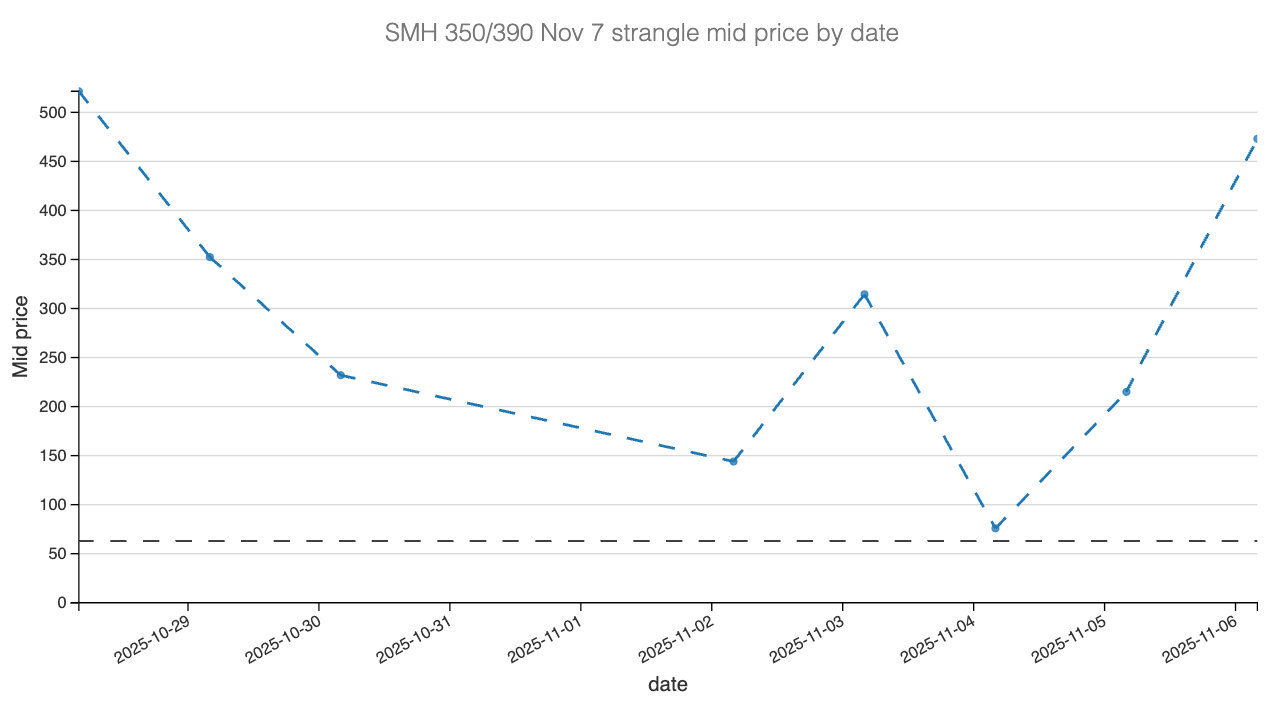 A few remarks we received from our readers: on the Thursday before the open, our signal was pointing to a strangle price of around $5.25, based on Wednesday’s close. But by the open, $5.25 was nowhere to be found, as implied volatility had been crushed following big tech earnings. Still, you could sell a respectable 42% IV, which kept the thesis intact.