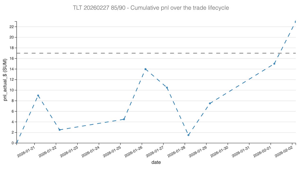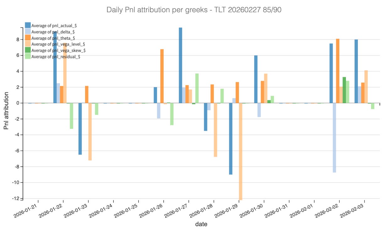 Finally, Delta and Gamma acted as minor noise rather than structural risks. The brief price spike in TLT following the Davos headlines created the temporary PnL dip seen on the chart. This created directional exposure (Delta), but because the move normalized quickly, we weren’t forced to hedge or realize losses on the directional component. The price never challenged our strikes seriously, meaning the negative Gamma acceleration never kicked in.