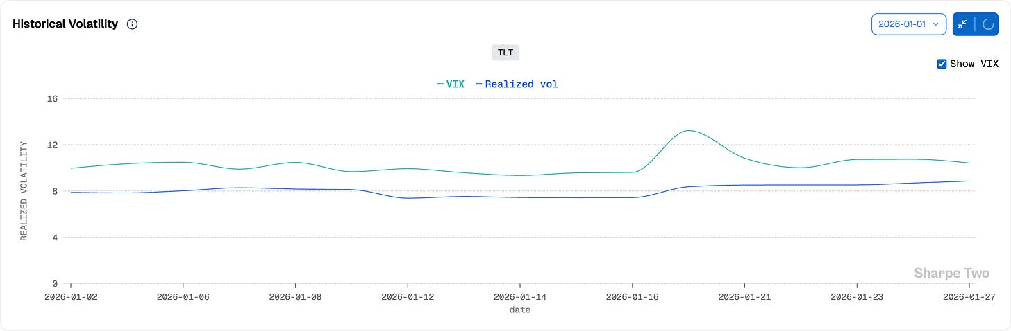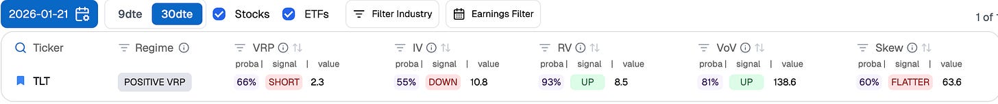 In our Signal du Jour from two weeks ago, we highlighted an opportunity to short the 85/90 TLT strangle in the Feb 27 expiry. At the time, the market had experienced a bit of an awakening right before the World Economic Forum in Davos. The realization that geopolitics would remain a central theme in 2026 caused implied volatility in bonds to rise sharply over the weekend, driven by aggressive rhetoric regarding Greenland.