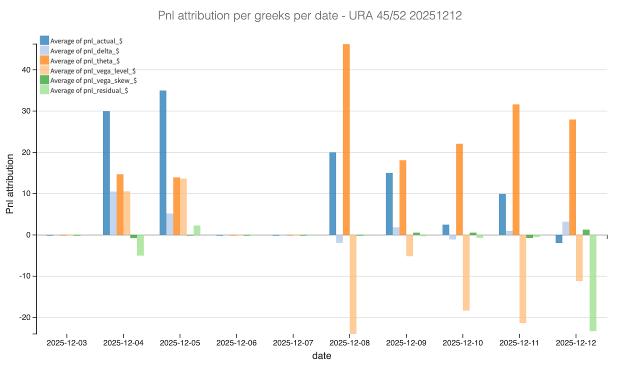Delta, as expected, was noisy and episodic. The +4% move in URA on the day of entry shows up clearly as an initial drag on PnL. However, this impact remained contained and never snowballed into a structural problem. The lack of follow-through was key: once the underlying stopped trending, delta stopped mattering, and the trade reverted back to being driven by carry and vol.