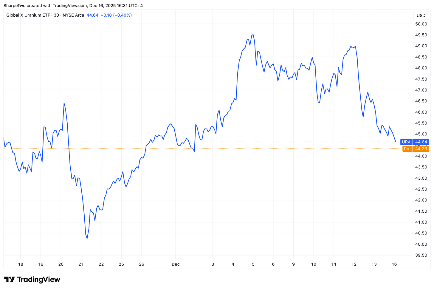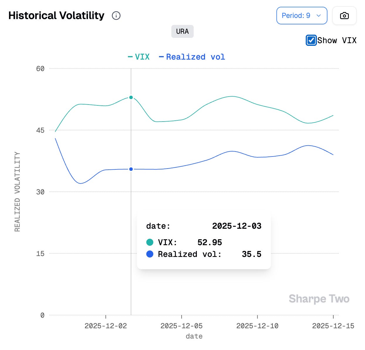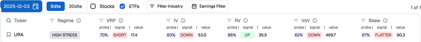 n our Signal du Jour from two weeks ago, we highlighted a short volatility opportunity in URA through the 45/52 strangle expiring on Dec 12. The particularity of this trade was the absence of a variance risk premium when measured at 30 dte, combined with a strong one at 9 dte. This made it a slightly riskier trade than what we usually take: if volatility had come back after Thanksgiving and the short-dated thesis at 9 dte had shifted quickly, there would have been little room to fall back on the longer timeframe and give the position some breathing space.