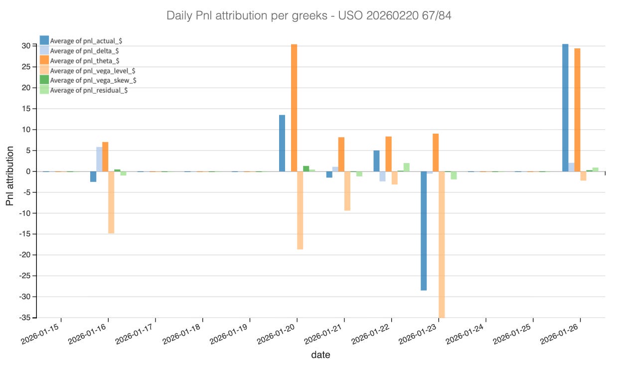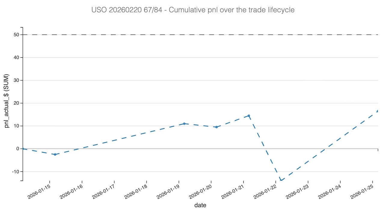 Furthermore, the Delta and Gamma impact reflects the “grind higher” visible in the USO price chart. While the underlying remained safely within our 67/84 strikes, the increase in realized volatility meant we were constantly fighting small directional fires. Ultimately, the massive loss generated by the Vega expansion completely neutralized the gains harvested from Theta. This confirms our earlier conclusion: shorting options is never just about waiting for time to pass, it is a specific bet on volatility remaining contained. When that thesis fails, no amount of time decay can save the PnL.