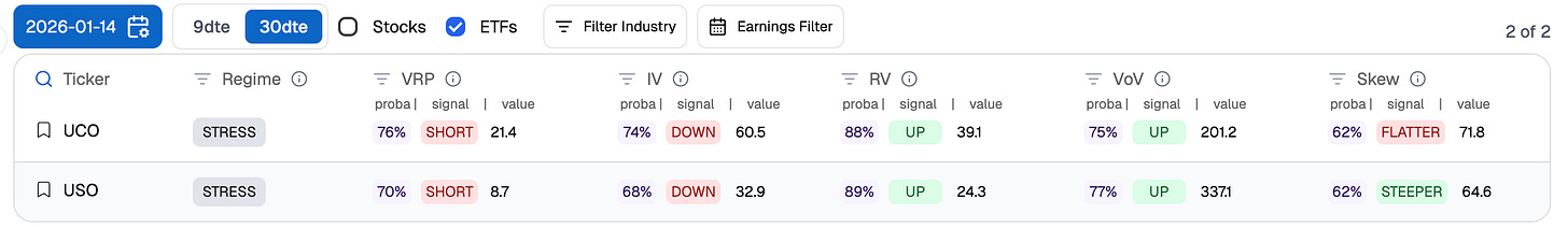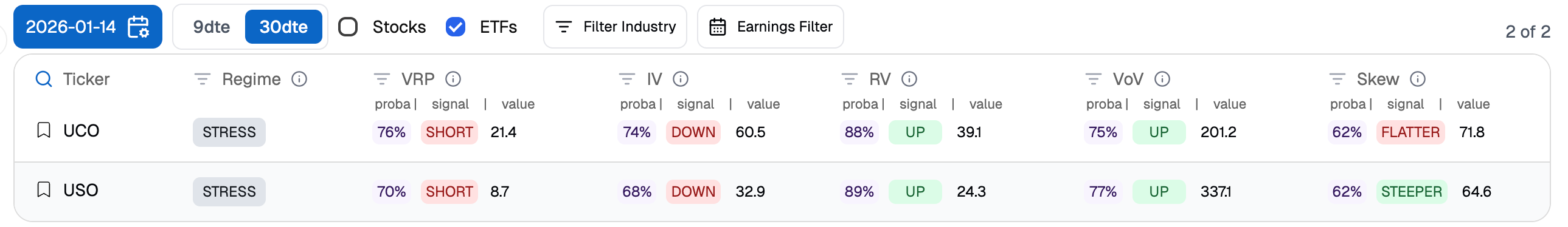 There was a 70% chance that the implied volatility sold would exceed the subsequent realized volatility throughout the life of the option. That probability climbed to 76% for UCO.