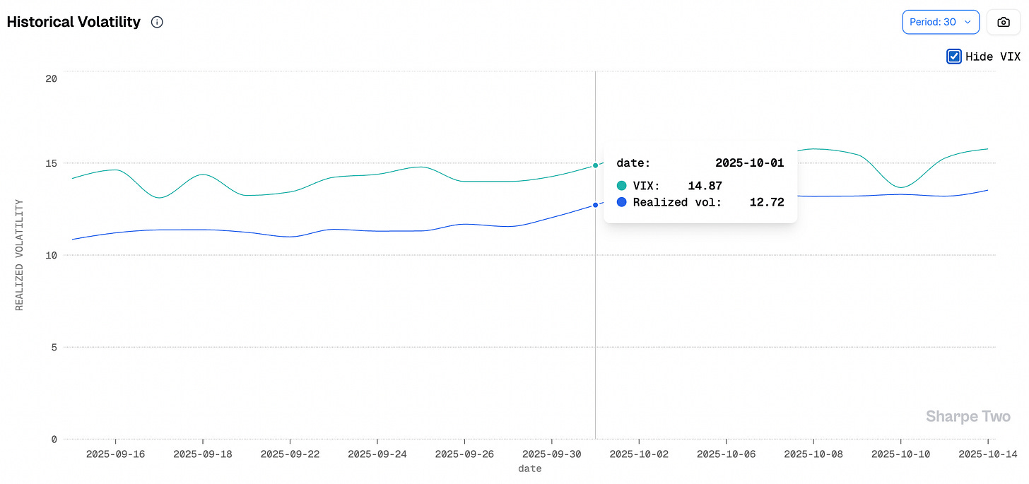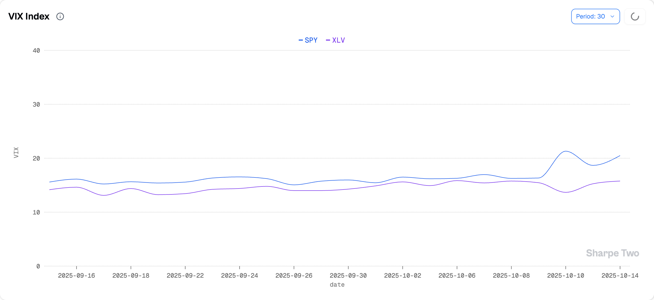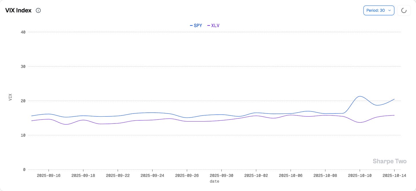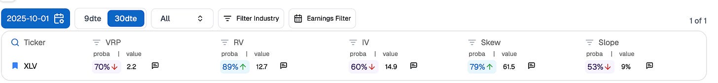 The edge was thin but present: you could sell implied volatility at 14.9 with roughly a 70% probability that subsequent realized volatility would stay below it. XLV — the healthcare ETF — is far calmer than its evil cousin XBI (biotech). And while a 2-point VRP may look slim, we also knew it would take a major shock to push realized volatility above that level.