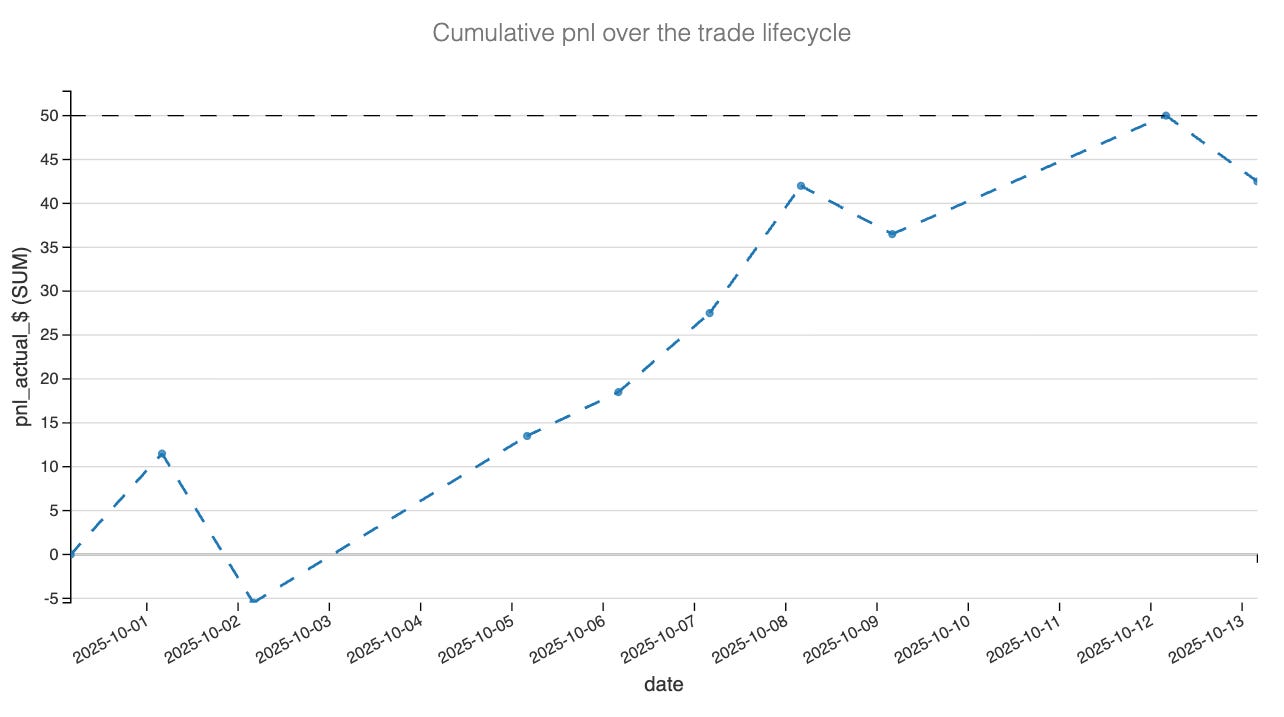 Looking at the attribution, most of the gains came exactly where we wanted them to — from vega level and theta. The cumulative PnL chart shows a steady rise over the two-week window, peaking near our exit target. Daily PnL fluctuations were modest, and there was no evidence of large gamma-induced noise, which reinforces that the short-vol thesis behaved as intended.