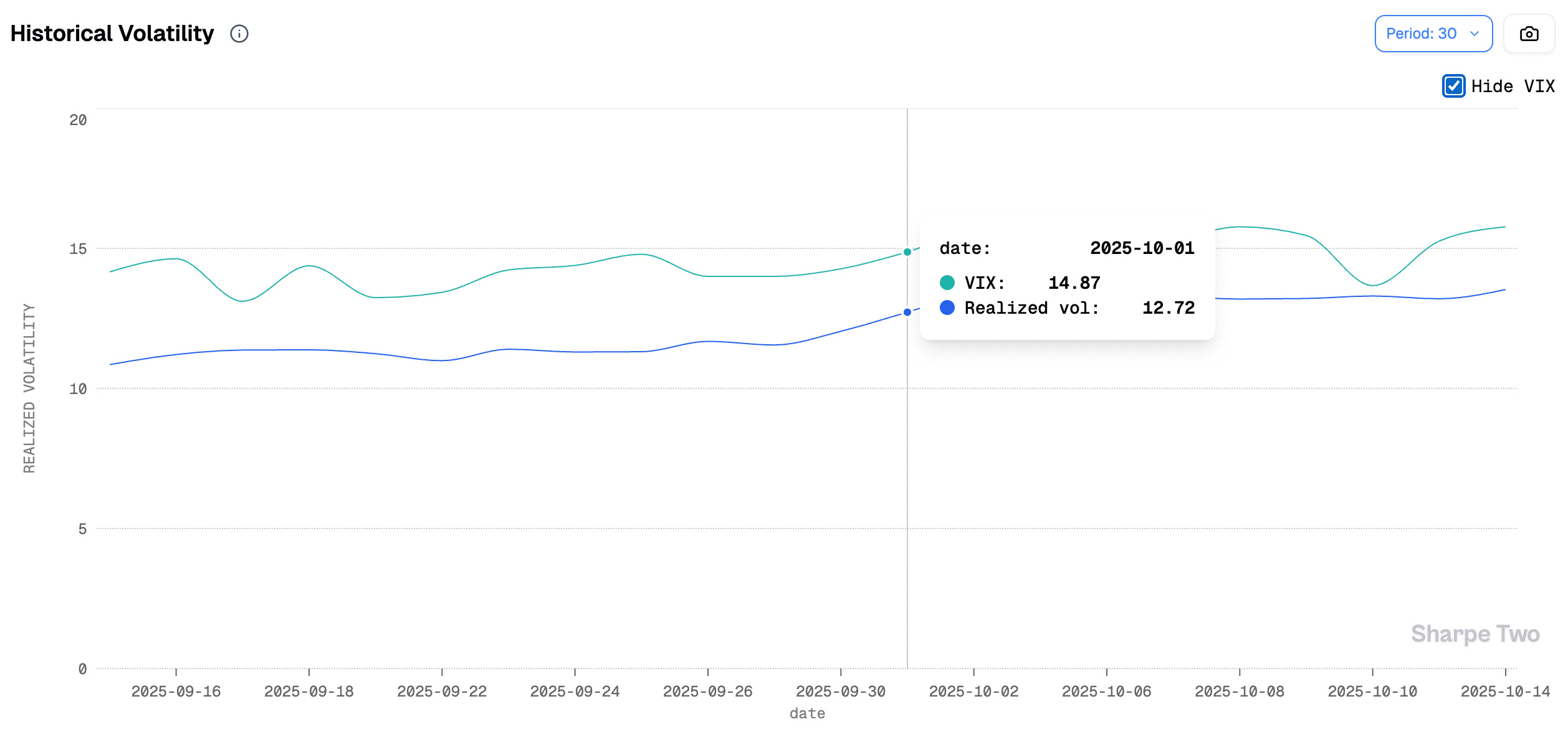 In any case, the blow was far from terrible. From the 14.9% implied volatility available when we entered the trade, IV never seriously challenged the position. What about realized volatility — where the real risk sits? It did rise over the life of the trade, climbing from 12.7 to 13.5.